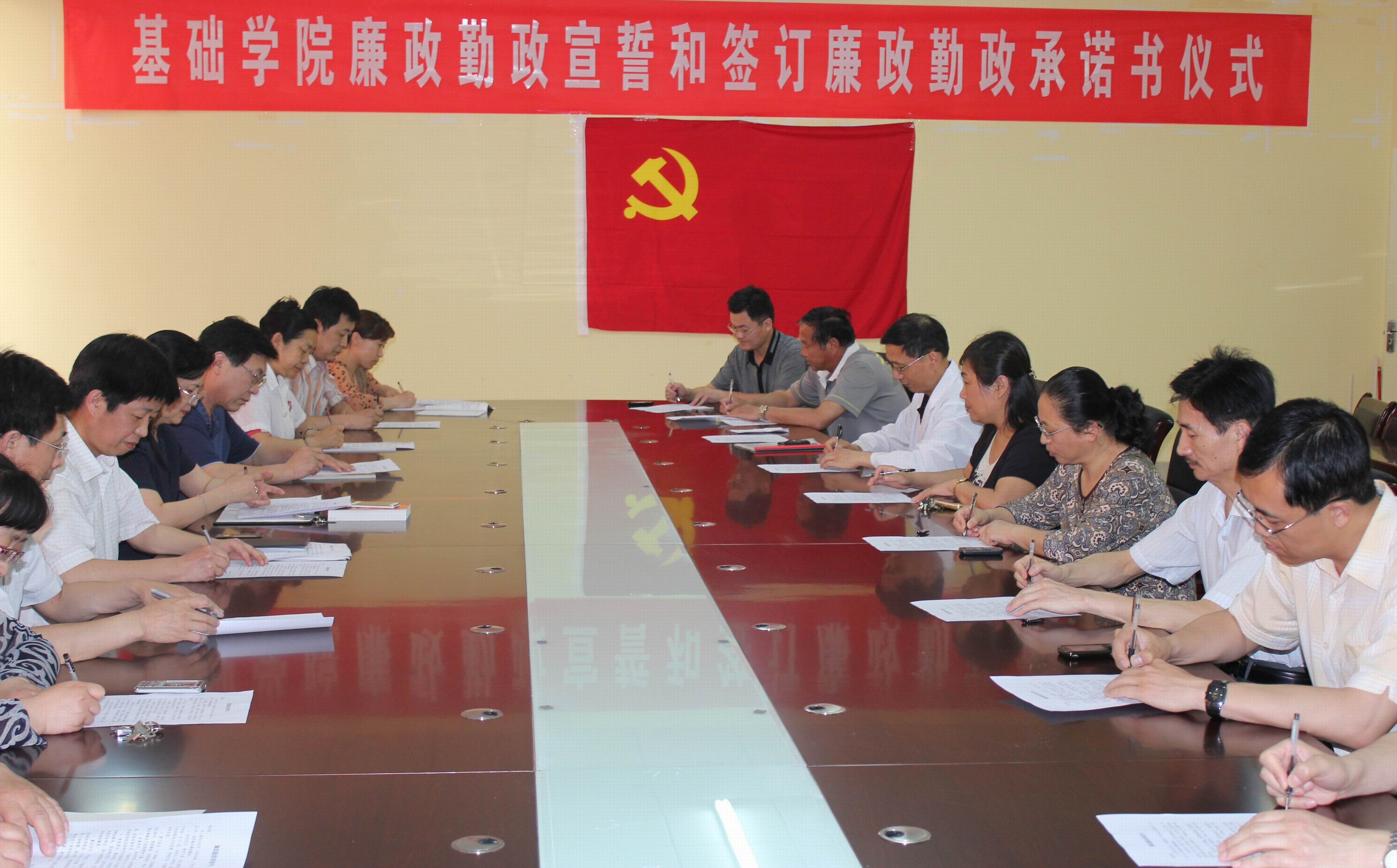我院科以上干部、党支部书记、教研室主任和实验室主任面向党旗庄严宣誓,并签订廉政勤政承诺书。基础学院分管党务工作副院长郭子林就加强我院廉政勤政建设做了工作讲话,要求我院党员干部恪守从政道德,立足本职,廉政勤政,干事创业,践行诺言,以坚强的党性、清廉的品质、高尚的情操、务实的作风、一流的业绩,做一名师生满意的好党员、好干部.