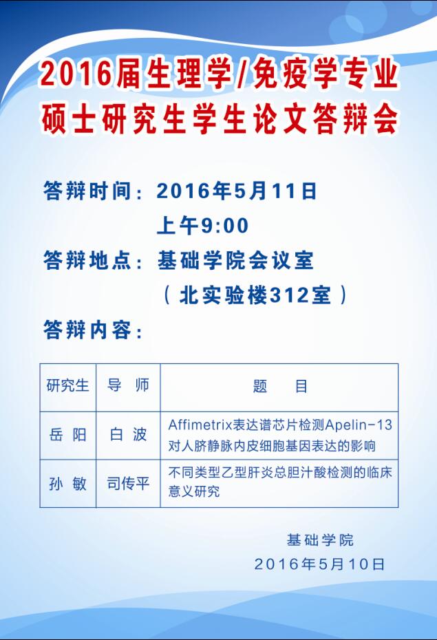 2016届生理学/免疫学专业硕士研究生学生论文答辩会