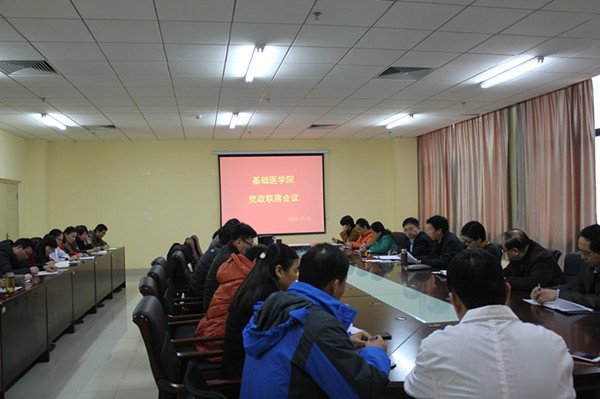 王传功就学院 “十三五”发展规划的修订、基础医学平台项目进展、2017年人才队伍建设、基础医学科学学位研究生授权点申报准备、学期末实验室安全等工作进行了通报、部署与安排。他要求,各教研室、实验室近期要做好本年度的工作总结,并按照学校和学院“十三五”的发展目标,认真做好2017年的各项工作计划。