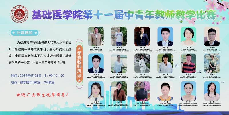 为促进青年教师业务能力和育人水平的提升,搭建青年教师成长平台,强化师资队伍建设,全面提高教学水平和人才培养质量,体育竞彩推荐平台app特举办第十一届中青年教师教学比赛。经科室选拔推荐,共有10个学科的18名选手入围决赛,现将决赛事宜通知如下。