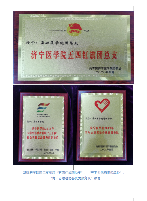 团总支2019年、2020年两次荣获校“五四红旗团总支”称号;2019年“医路同行”、“医展鸿图”志愿服务队荣获山东省暑期“三下乡”优秀服务队;体育竞彩推荐平台app青年志愿者协会,在2019年校志愿者协会考核中名列第一,被评为济宁市志愿服务先进集体。