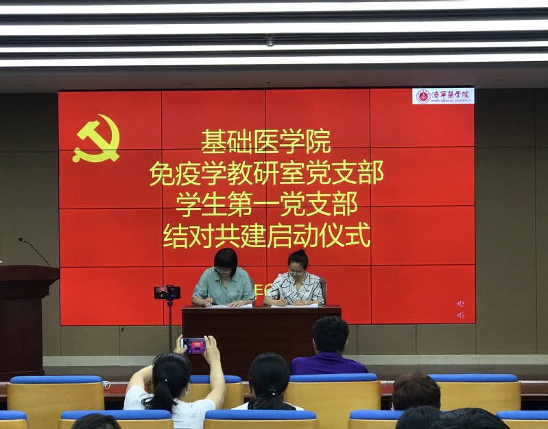 启动仪式上,全体党员重温入党誓词,进行入党宣誓;为预备党员佩戴党徽;免疫学教研室党支部向学生党员赠送了《新中国发展面对面》书籍;学生党支部书记傅莹和免疫学教研室党支部书记李春霞签订了《结对共建协议书》。