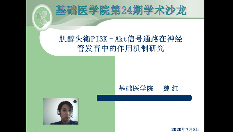 魏红围绕《肌醇失衡PI3K_Akt信号通路在神经管发育中的作用机制研究》科技文献,对神经管畸形发生的病理形态学改变及分子机制进行了详细地阐述,分享了论文阅读中的一些体会。与会师生就文献中感兴趣的问题与魏红老师进行了在线交流。