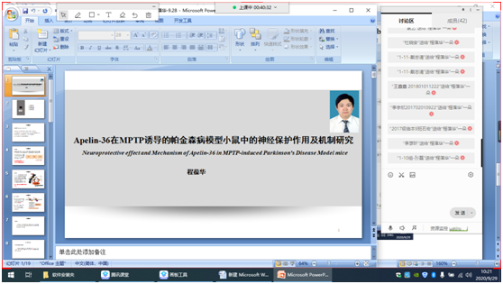 为促进科研交流、浓厚学术氛围,搭建师生共同学习、交流分享的平台,9月29日上午,体育竞彩推荐平台app通过腾讯课堂线上举办第三十九期博士论坛。程葆华博士作了题为《Apelin-36在MPTP诱导的帕金森病模型小鼠中的神经保护作用及机制研究》的学术报告。