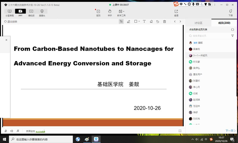 姜靓老师围绕《From Carbon-Based Nanotubes to Nanocages for Advanced Energy Conversion and Storage》科技文献,对碳纳米管和碳纳米笼的形成机理、制备方法及其在储能和能源转化领域的应用进行了详细地阐述,分享了论文阅读中的一些体会。与会师生就文献中感兴趣的问题与姜靓老师进行了在线交流。