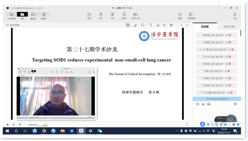 崔老师围绕《Targeting SOD1 reduces experimental non–small-cell lung cancer》科技文献,该文献阐明了小分子化合物ATN-224抑制超氧化物歧化酶1,降低抗氧化剂谷胱甘肽过氧化物酶的酶活性,导致细胞内过氧化氢(H2O2)水平升高,诱导肺癌细胞死亡。ATN-224诱导的细胞死亡是通过H2O2介导的P38 MAPK激活,而P38的激活导致抗凋亡因子MCL1的降低。同时分享了论文阅读中的一些体会,与会师生就文献中感兴趣的问题进行了在线交流。