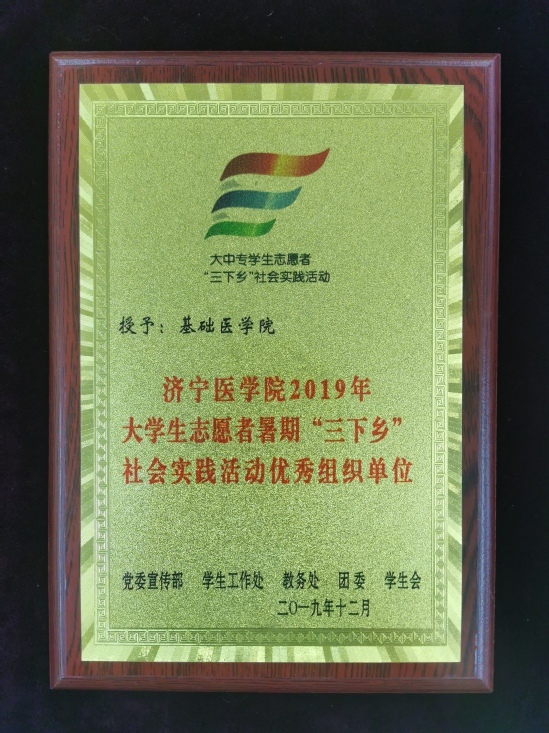 有济宁喻屯卫生院、鱼台县张黄镇卫生院、古槐街道北门社区共3处社会实践基地,在我校2019年大学生志愿者暑期“三下乡”服务队评选中,两支队伍位列第一、第三,双双被评为省级优秀服务队。